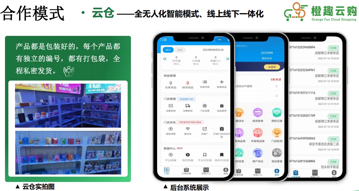 安徽橙趣云购品牌管理有限公司重资投入研发,推出无人售货机系统与外卖系统,线上云仓+美团、饿了么外卖+智能售货柜+私域商城,为合伙人提供从商品上架、营销推广的全链条运营服务,助力合作伙伴轻松经营。