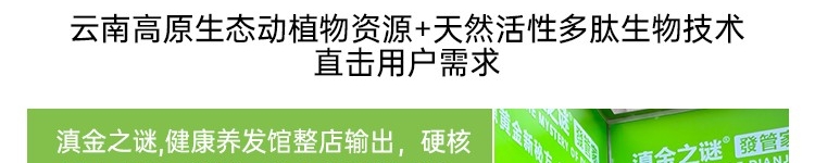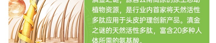 滇金之谜,源自云南高原的原生态动植物资源,是行业内首家将天然活性多肽应用于头皮护理创新产品。滇金之谜的天然活性多肽,富含20多种人体所需的氨基酸。