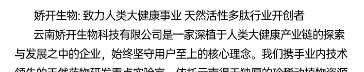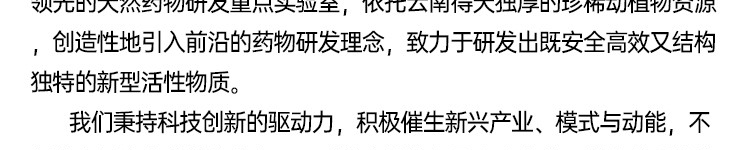 云南娇开生物科技有限公司是一家深植于人类大健康产业链的探索与发展之中的企业,始终坚守用户至上的核心理念。我们携手业内技术领先的天然药物研发重点实验室,依托云南得天独厚的珍稀动植物资源,创造性地引入前沿的药物研发理念,致力于研发出既安全高效又结构独特的新型活性物质。