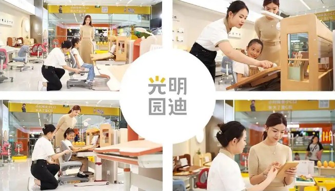 与线上“盲购”截然不同,光明园迪在全国600+城市布局了1600+门店。走进门店,专业顾问会热情接待,他们就像孩子学习成长路上的贴心管家。会耐心引导孩子体验不同款式的学习桌,根据孩子的身高、体型,精准调节桌椅高度和角度,让孩子现场感受怎样的坐姿才最舒适自然,手臂放置是否轻松,双脚能否平稳着地。