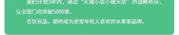 吾饮良品成立于2006年,率先抢占水果茶赛道,全国门店2500+家。荣登“2021年中国特色茶饮十大品牌榜”,更受消费者青睐。很荣幸有您加入,让我们共同在水果茶领域创造新辉煌!