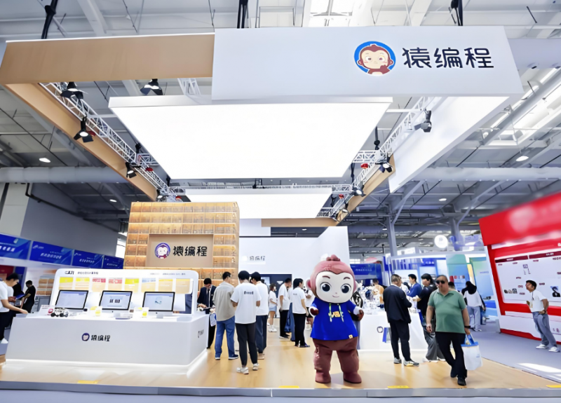 在猿编程展台前,一场别开生面的“技术闯关”正在上演。