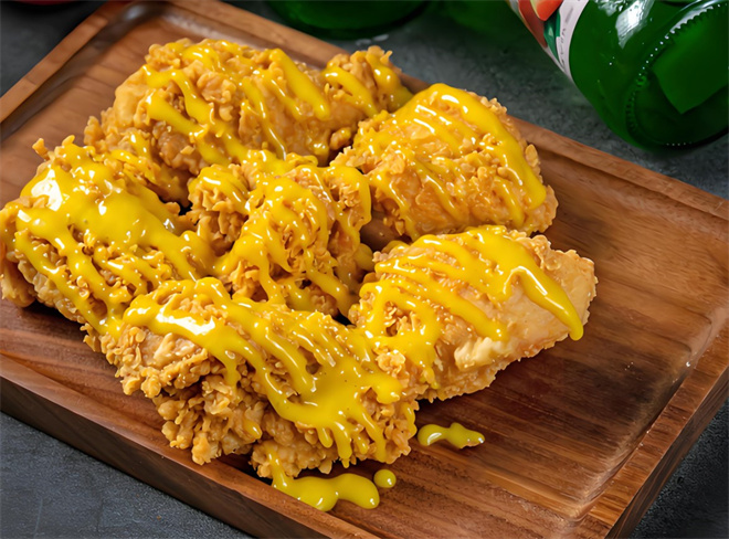 摘要正谈炸鸡精选高质量鲜鸡肉、经过几十道工序、采用低温油炸工艺,并搭配多种同调味腌制,制作出...